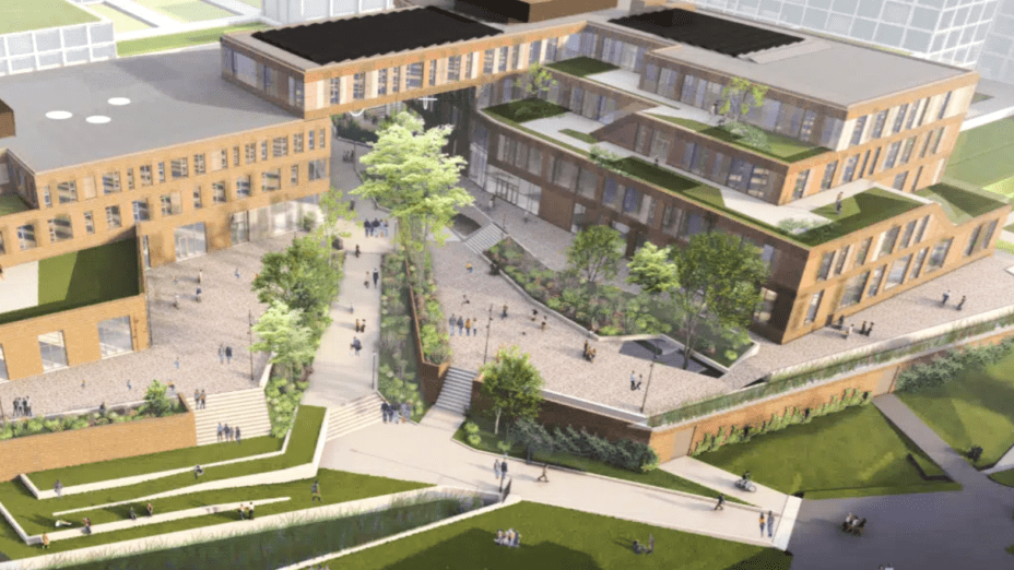 In Rotterdam, a new multifunctional district is being developed on the grounds of a former football complex. Part of the new campus will be an education and sports centre. The multi-storey buildings will create height differences, forming a beautiful park with squares, gardens and stairways. A narrow, elongated pond will border one of the squares.