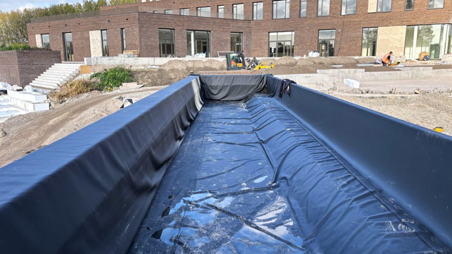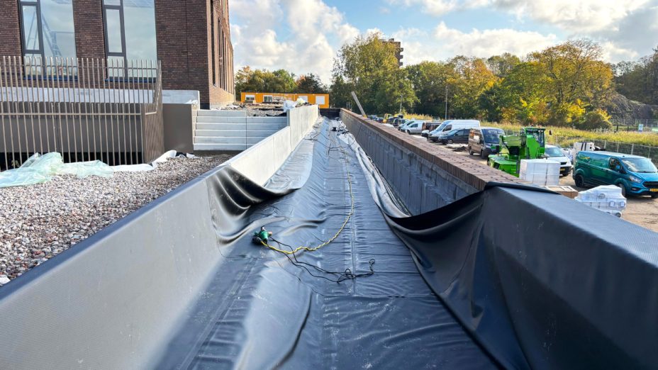 Our trusted partner Joosten Groep turned to NPI for the installation of the pond liner. As the pond is situated on top of a bicycle parking deck, it was essential to ensure complete watertightness. The shape of the pond posed quite a challenge, with several corners and complex details for fixing the liner.