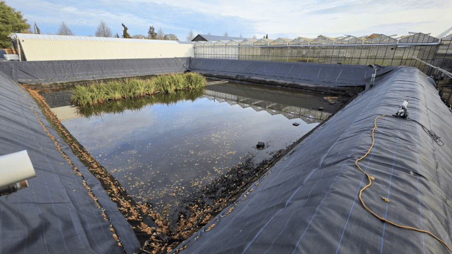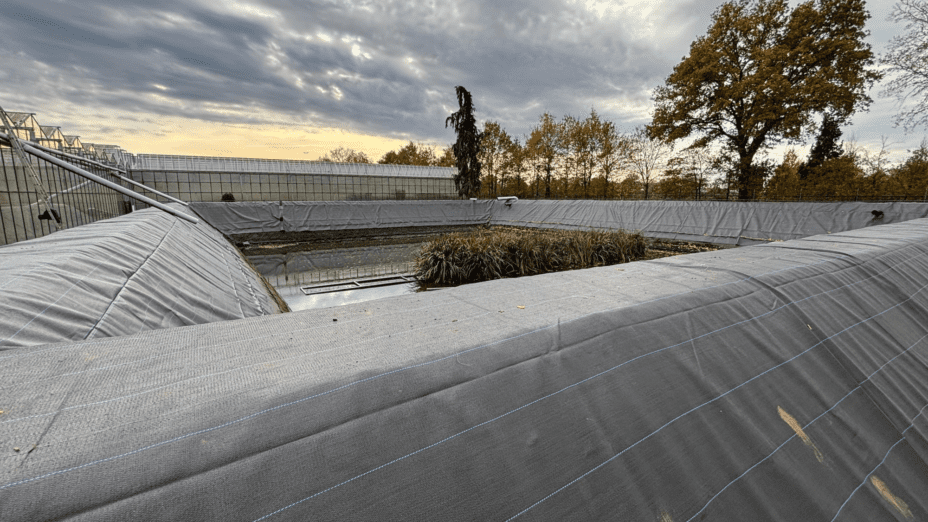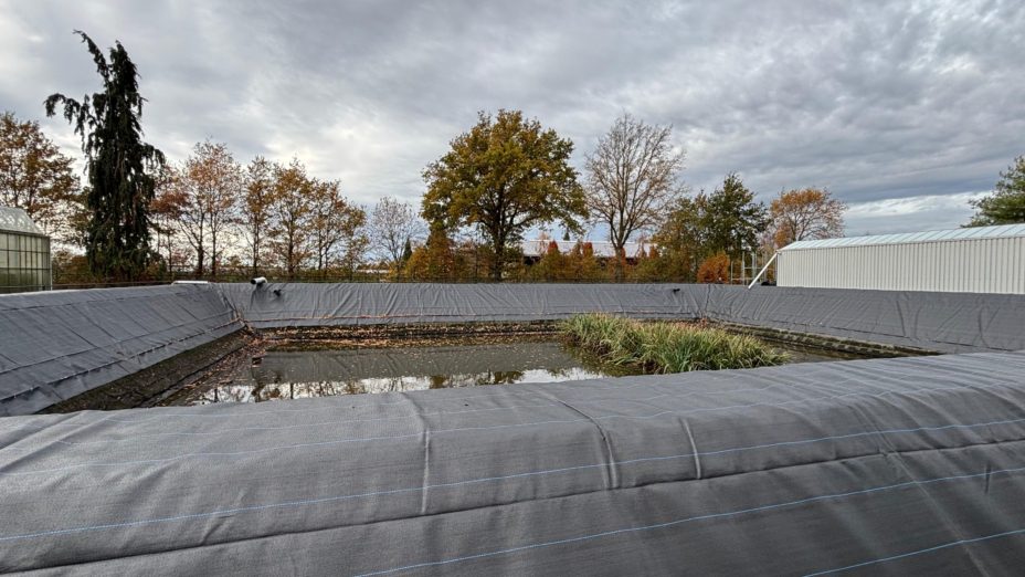 De kweker heeft een waterbassin voor irrigatie op het erf, waarvan de taludbescherming na 20 jaar vervangen moest worden. De kwekerij koos voor het zwaarste doek, geotextiel van 270 grams. Ons team begeleidde het intrekken van het doek en het confectioneren van het doek op de taluds. Ze werkten de taludbescherming af met een tegelzoom van 50 cm rondom, aan de binnenzijde van het bassin.
